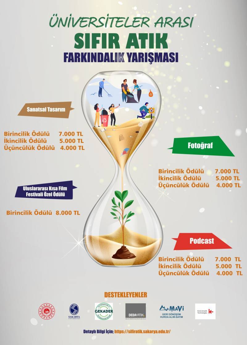 Üniversite öğrencilerinin, akademik ve idari personelinin dikkatini sıfır atık konusuna çekmek ve kamuoyunun tüm kesimlerini bilgilendirmek amacıyla Sakarya Üniversitesi’nin öncülüğünde Uluslararası Kısa Film Festivali’nde Sıfır Atık Temalı Kısa Film özel ödül yarışması ile Üniversitelerarası Podcast, Fotoğraf ve Sanatsal Tasarım yarışmaları düzenlenecektir.