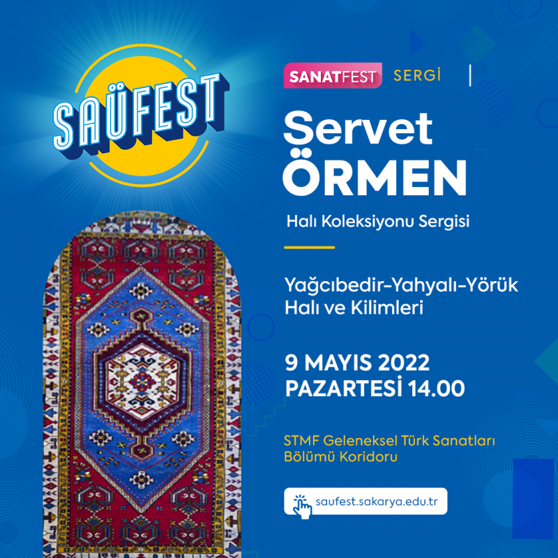 Servet Örmen'in Yağcıbedir- Yahyalı –Yörük Halı ve Kilimlerini tanıttığı sergisi 9-18.05.2022 tarihleri arasında Sanat Tasarım ve Mimarlık Fakültesi Geleneksel Türk Sanatları Bölümü Koridor Galerisi’nde SAÜFEST etkinlikleri kapsamında öğrenciler ve sanatseverlerle buluşacak.