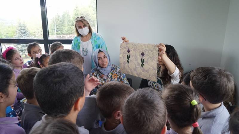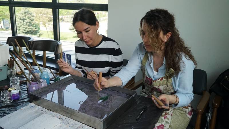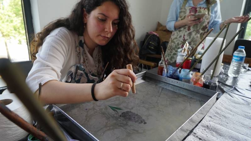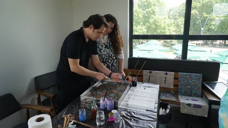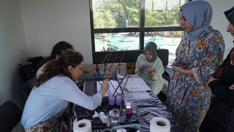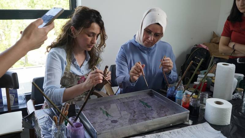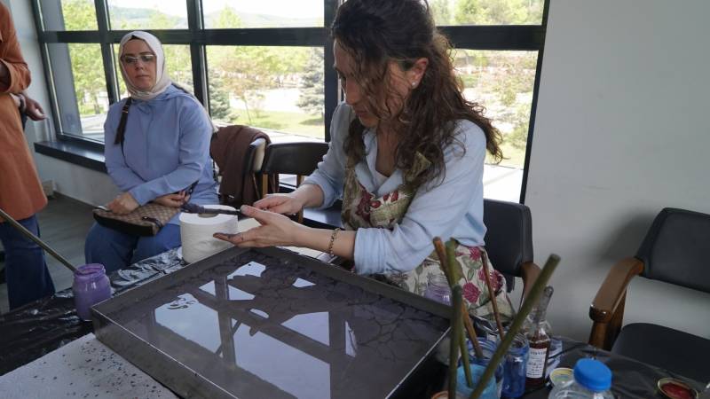 Geleneksel Türk Sanatları Bölümünde görev yapan Öğr. Gör. Songül Ergün tarafından SAÜFEST 2022 sanat etkinlikleri kapsamında 17 Mayıs Salı günü saat 13:00-16:00 arasında bir ebru çalıştayı gerçekleştirildi. Ebru sanatı ve tarihi hakkında verilen bilgiler ile başlayan çalıştayda çeşitli ebru sanatı örnekler ile uygulandı. Ebru tekniğiyle uygulanan çeşitli örnekler ile öğrencilerle birlikte çalışıldı. Kahve Keyfi 2. kattaki çalıştaya üniversite ve şehirdeki okullardan ilk öğretimde okuyan öğrenciler ve öğretim elemanları katıldı.