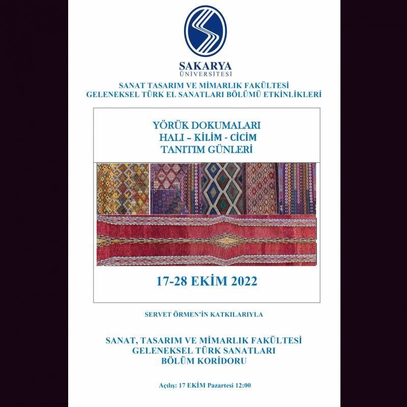 Sakarya Üniversitesi, Sanat Tasarım ve Mimarlık Fakültesi, Geleneksel Türk Sanatları Bölümü 17-28 Ekim 2022 tarihleri arasında Av. Servet Örmen’e ait yörük dokumalarından oluşan bir koleksiyonu bölüm koridorunda sergiliyor. Anadolu’nun çeşitli yörelerinden toplanan halı, kilim ve cicim dokumalarından oluşan koleksiyon 17 Ekim Pazartesi günü saat 12:00’deki açılışın ardından izleyici ile buluşacak.
