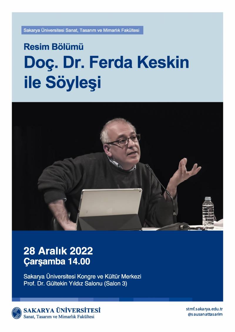 Sakarya Üniversitesi Sanat Tasarım ve Mimarlık Fakültesi Resim Bölümü tarafından düzenlenen etkinlik kapsamında, Bilgi Üniversitesi Felsefe ve Toplumsal Düşünce Yüksek Lisans Programı öğretim üyesi Doç. Dr. Ferda Keskin ile 28 Aralık 2022 Çarşamba Saat 14.00'da Sakarya Üniversitesi Kültür ve Kongre Merkezi Prof. Dr. Gültekin Yıldız Salonu'nda (Salon 3) söyleşi gerçekleştirilecektir.