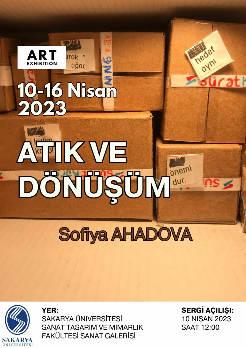 Sakarya Üniversitesi Sosyal Bilimler Enstitüsü Resim Anasanat dalı yüksek lisans öğrencisi Sofiya Ahadova'nın; “Modern Sanat ve sonrası sanat alanında bir ifade aracı olarak atık” isimli yüksek lisans tez çalışması kapsamında hazırladığı “ATIK VE DÖNÜŞÜM” isimli sergisi, Sanat Tasarım ve Mimarlık Fakültesi Sanat Galerisinde 10 Nisan 2023’ te saat 12.00 açılıyor. Sergi 16 Nisan 2023’e kadar izlenebilir.