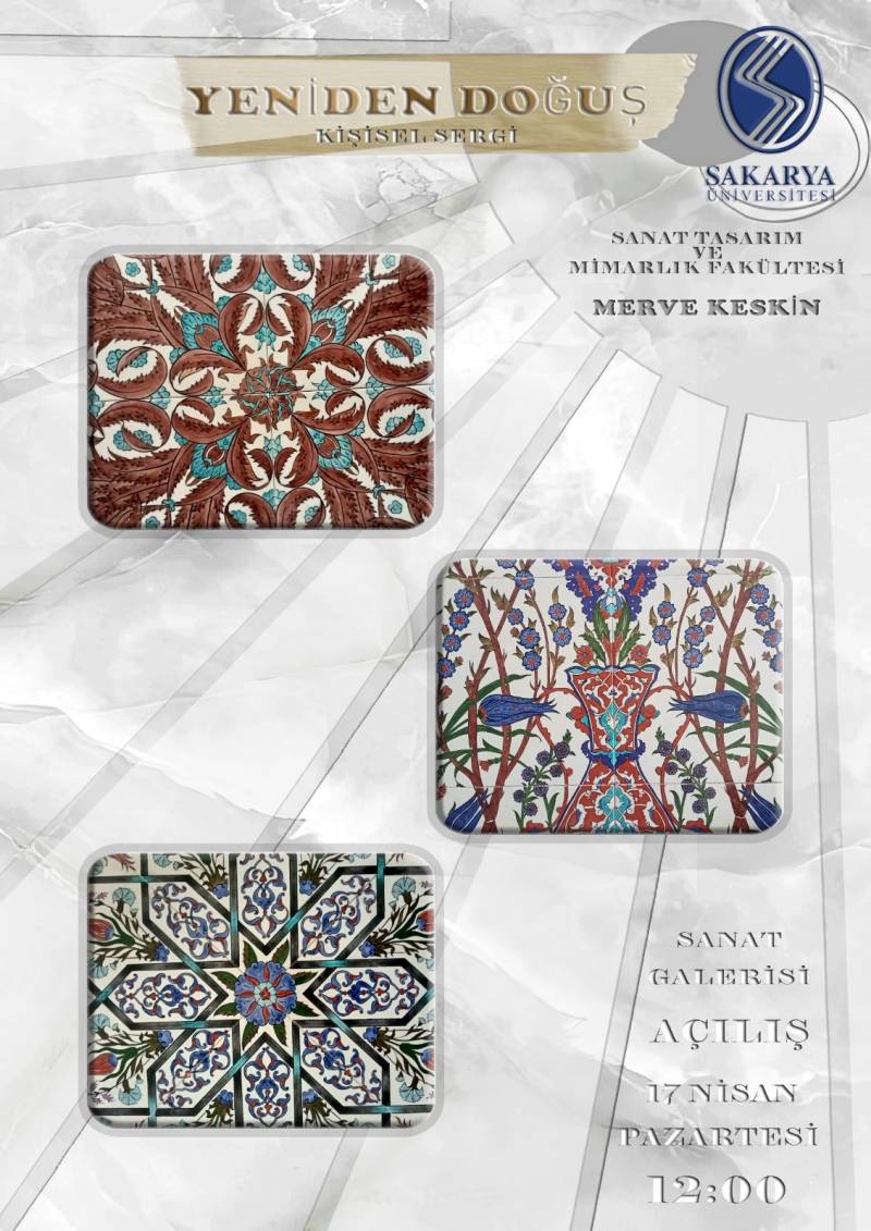 Sakarya Üniversitesi Sosyal Bilimler Enstitüsü Geleneksel Türk Sanatları yüksek lisans öğrencisi Merve Keskin’in ‘Yeniden Doğuş’ isimli kişisel sergisi 17 Nisan 2023 günü saat 12.00’da Sakarya Üniversitesi Sanat Tasarım ve Mimarlık Fakültesi Sanat Galerisinde ziyaretçilerine kapılarını açıyor. Sergide öğrencinin yüksek lisans döneminde yaptığı çini, minyatür, mozaik, vb. eserlere yer verilmiştir.