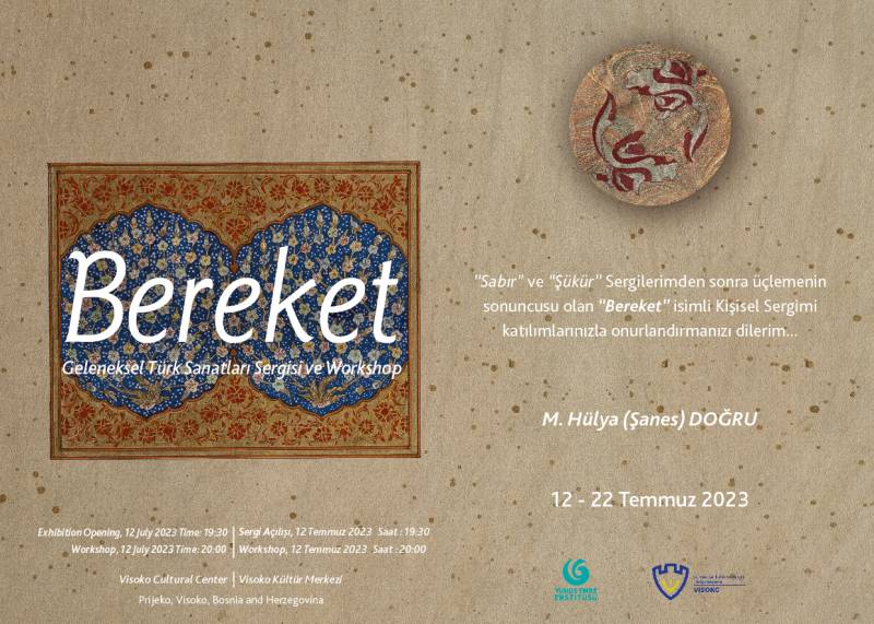 Sanat Tasarım ve Mimarlık Fakültesi Geleneksel Türk Sanatları Bölümü öğretim üyesi Doç. Mesude Hülya Doğru, Saraybosna’nın Visoko şehrinde, 12-22 Temmuz 2022 tarihleri arasında “Bereket” isimli sergisini Visoko Kültür Merkezi’nde izleyicisi ile buluşturuyor. Bir üçleme olarak planlanan, 2015 yılında açılan “Sabır” ve 2016 yılında açılan “Şükür” sergilerinden sonra üçlemenin sonuncusu olan “Bereket” Sergisinde 30 eser yer alacak. Sergi açılışı sonrasında kitap sanatları arasında yer alan Tezhip sanatı örneklerinin tasarım ve uygulama aşamalarının anlatıldığı, aynı zamanda tarihsel bilgilerin paylaşıldığı bir workshop çalışması yapılacak.