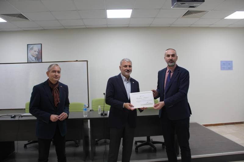 Başkan Altuğ’a söyleşinin sonunda SAÜ Rektör Yardımcısı Prof. Dr. Özer Uygun ve Fakülte Dekanı Prof. Dr. Tahsin Turğay tarafından teşekkür belgesi takdim edildi.