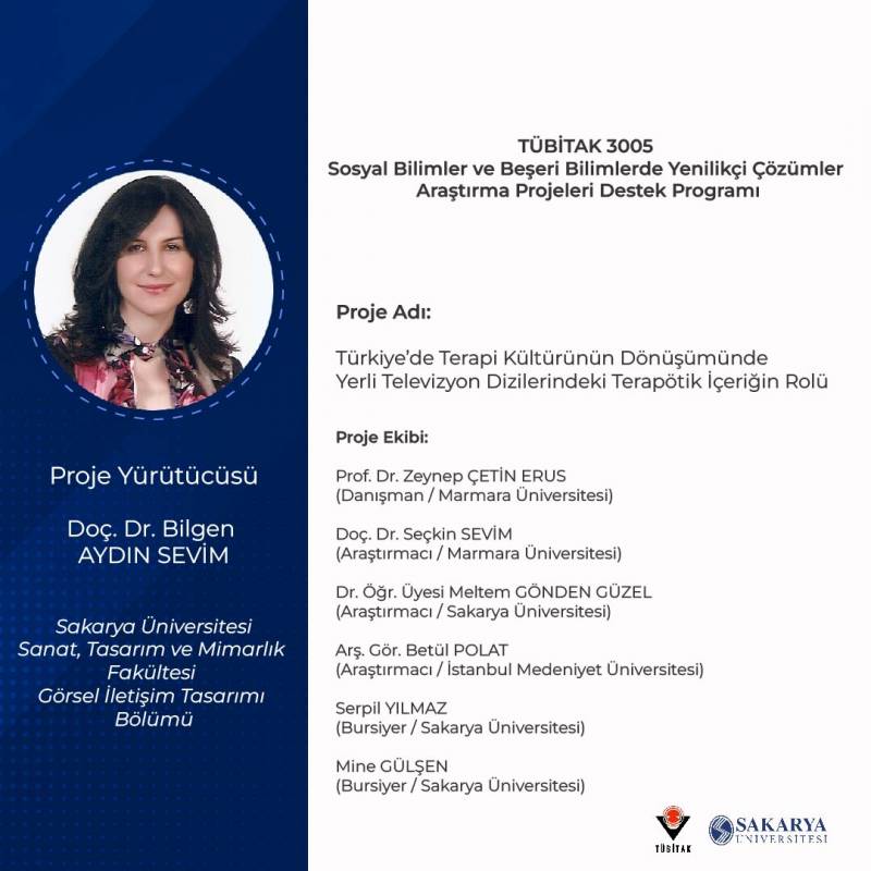 Sakarya Üniversitesi Sanat, Tasarım ve Mimarlık Fakültesi Görsel İletişim Tasarımı Bölümü öğretim üyesi Doç. Dr. Bilgen AYDIN SEVİM’in yürütücülüğünü yaptığı “Türkiye’de Terapi Kültürünün Dönüşümünde Yerli Televizyon Dizilerindeki Terapötik