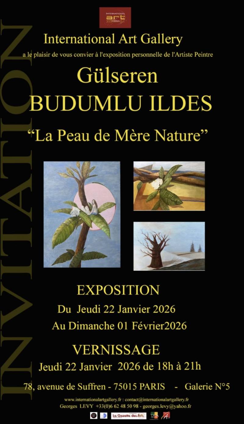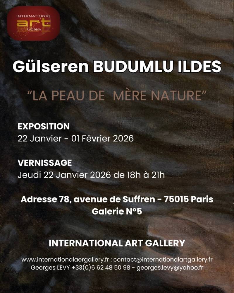 L'exposition personnelle de peintures de Gülseren Budumluİldeş, « La Peau de la Mère Nature », se tiendra à la Galerie internationale d'art de Paris, en France, du 22 janvier 2026 au 1er février 2026. Dans son exposition intitulée « Le Corps de Mère Nature », İldeş ne ​​construit pas un conte de fées qui glorifie la nature ; elle n'invite pas le spectateur à une admiration passive. Elle propose plutôt une rencontre. Unerencontre dépouillée de toute emphase l’humain cessed’être spectateur pour devenir présence. La nature n’y apparaîtni comme un paysage à contempler à distanceni comme un refuge symboliquemais comme une réalité sensible aveclaquelle entrer en contact.